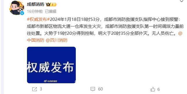 2024年1月18日18时53分,成都市消防救援支队指挥中心接到报警:成都市新都区物流大道一仓库发生火灾,成都市消防救援支队第一时间调派力量前往处置。火势于19时20分得到控制,明火于20时35分全部扑灭。无人员伤亡。