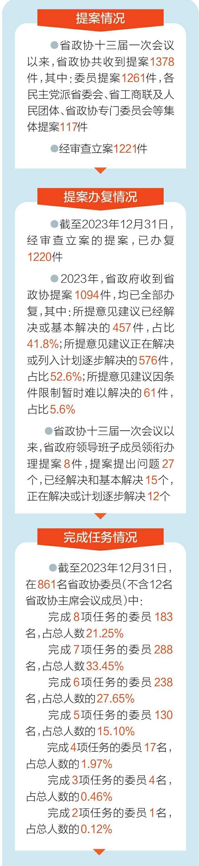 1月19日,记者从省政协办公厅获悉,省政协十三届一次会议重点提案已全部办理完成。截至2023年12月31日,20件重点提案所提意见建议均被采纳或部分采纳,有73条提案建议得到具体采纳,推动形成工作措施132项。