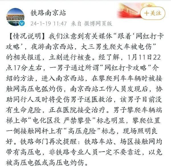 1月19日中午,南京火车站官微@铁路南京站 就“大学生到网红打卡地爬火车被电伤”一事发布情况说明称,受伤男子目前没有生命危险,正在医院治疗,事发现场的“电化区段 严禁攀登”标志明显、照明良好。