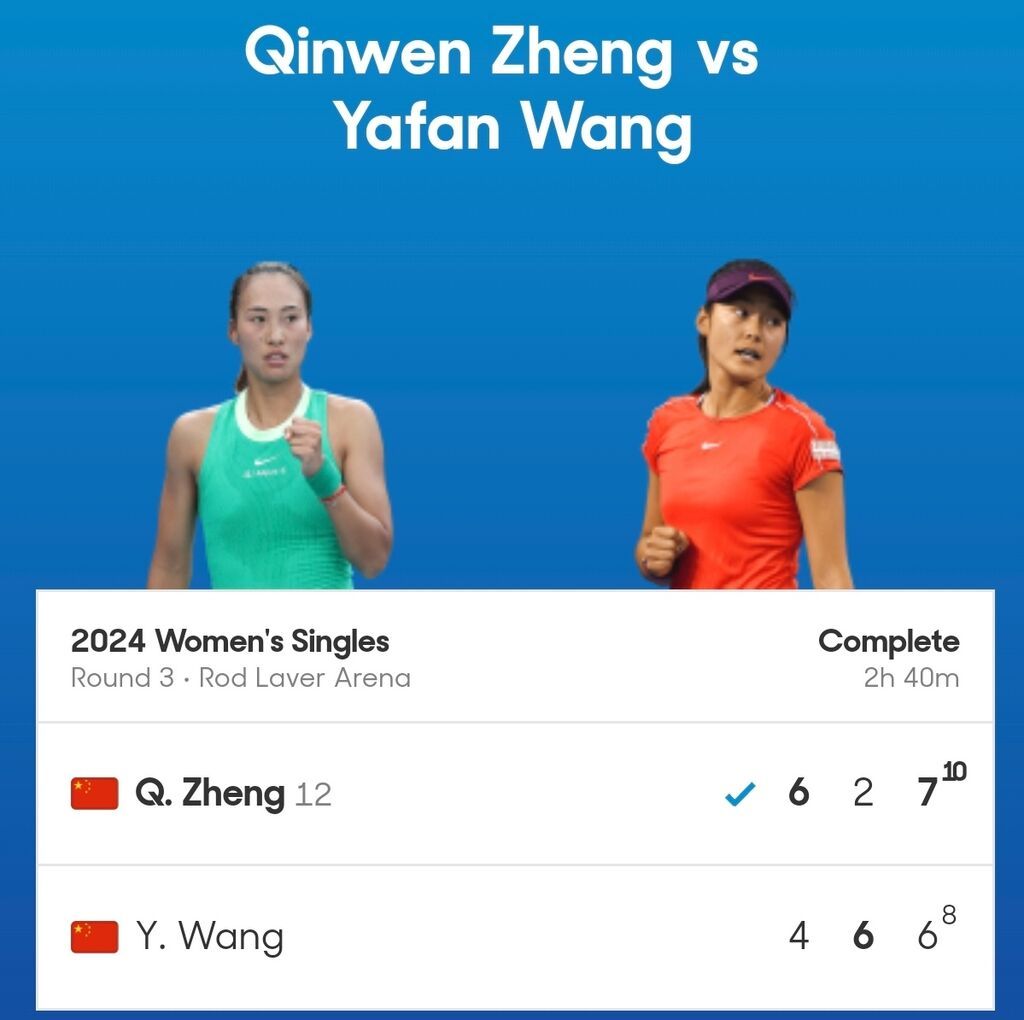 决胜盘,两人打得非常焦灼,进入到“抢十”阶段,郑钦文最终以10:8胜出,成功闯入澳网16强。王雅繁虽未能更进一步,但在本届赛事上刷新了个人大满贯最好成绩。在后续的比赛中,王雅繁还将搭档袁悦继续征战澳网女双第二轮赛事。