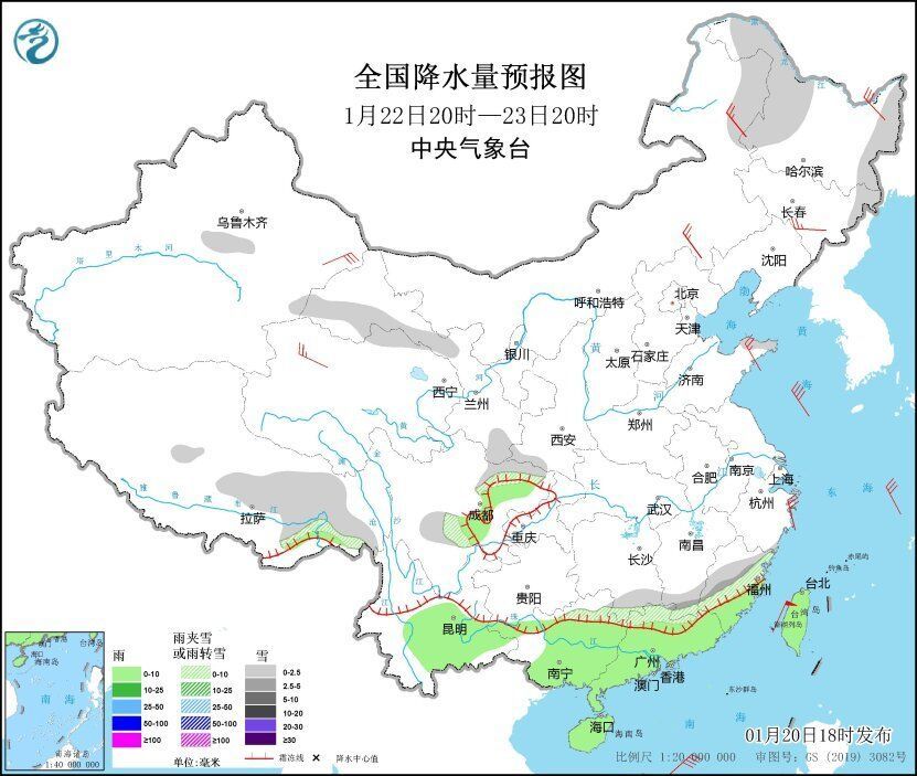 1月22日20时至23日20时,黑龙江西部和东部、山东半岛东北部、湖南南部、江西南部、福建西部、广东北部等地有小到中雪或雨夹雪。四川盆地、云南中东部、广西中南部、广东中南部、海南岛、台湾岛等地有小雨。新疆东部、甘肃西部、内蒙古东部、山东半岛等地的部分地区有4~6级风(见图4)。