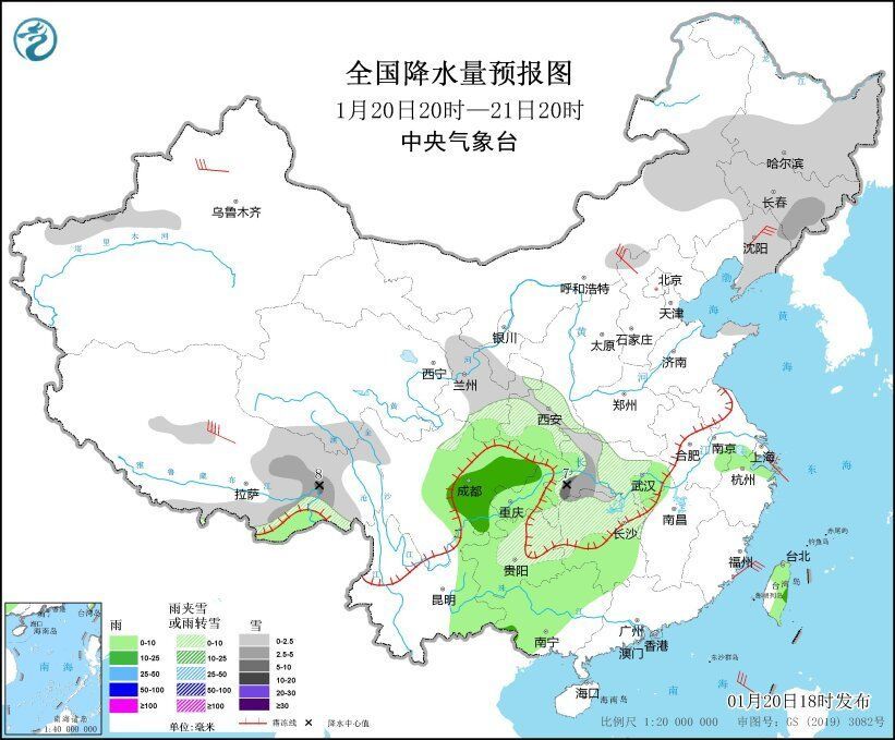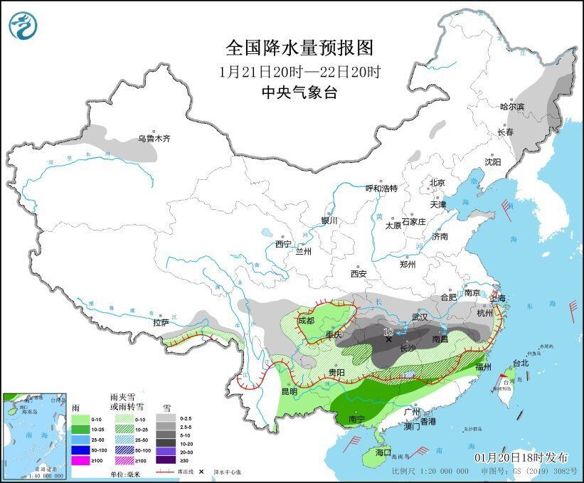 1月20日20时至21日20时,内蒙古中东部、东北地区大部、西藏东部、西北地区东部、西南地区东南部、江汉东部、江南西北部等地的部分地区有小雪或雨夹雪,其中,吉林东部、西藏东部、湖北南部和西部、湖南北部等地的部分地区有中到大雪(5~8毫米)。西北地区东南部、湖北东部、湖南南部、川西高原北部、西南地区东部、华南北部和西部、台湾岛等地的部分地区有小到中雨。新疆沿天山地区、西藏中北部、辽宁中部、河北北部、浙江东部等地的部分地区有5~6级风(见图2)。
