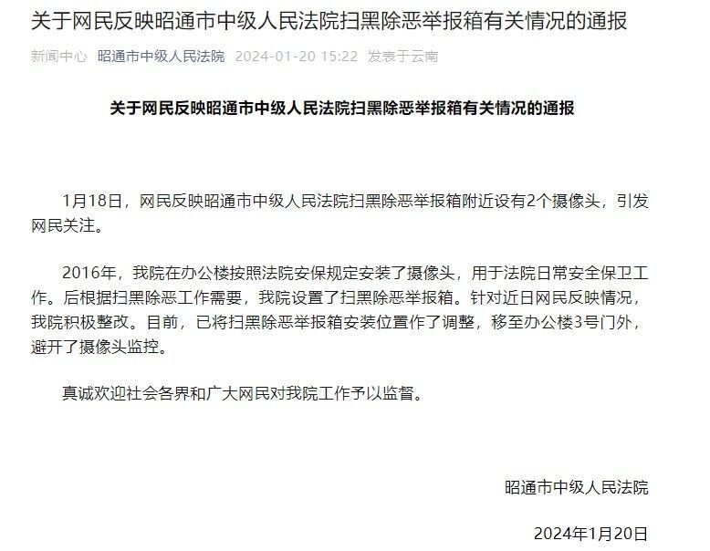 据昭通市中级人民法院官微消息,1月18日,网民反映昭通市中级人民法院扫黑除恶举报箱附近设有2个摄像头,引发网民关注。