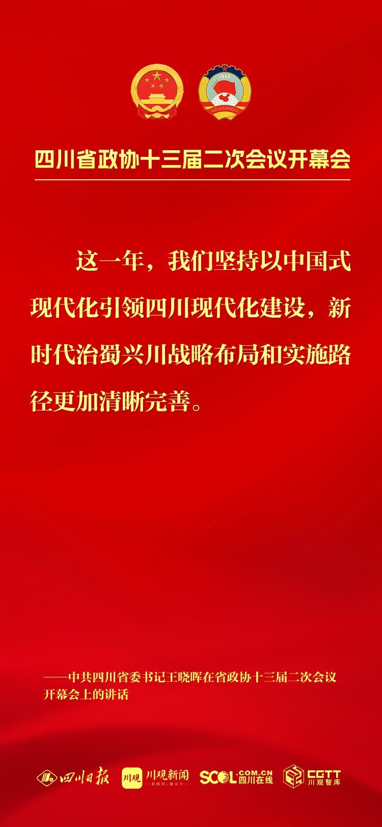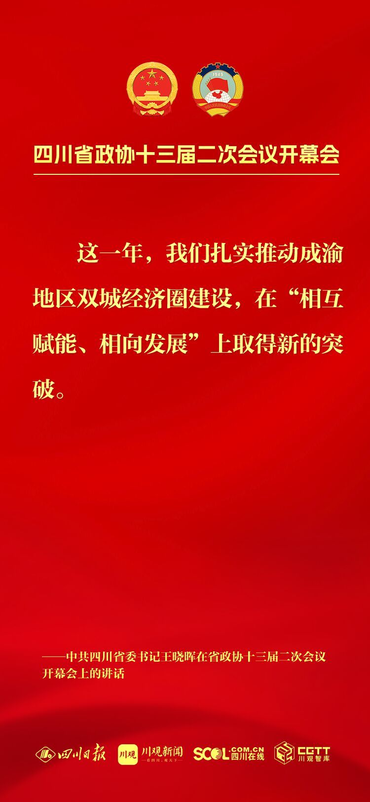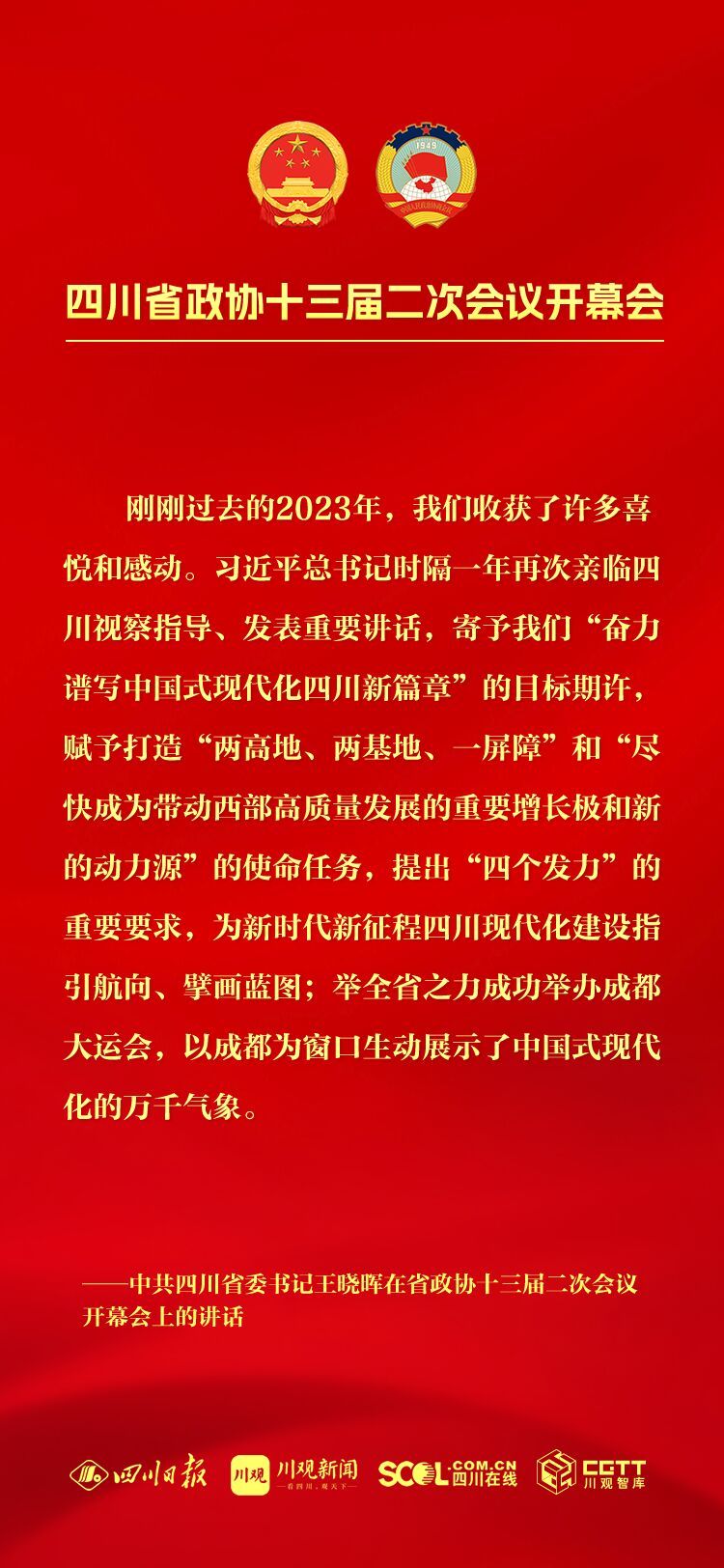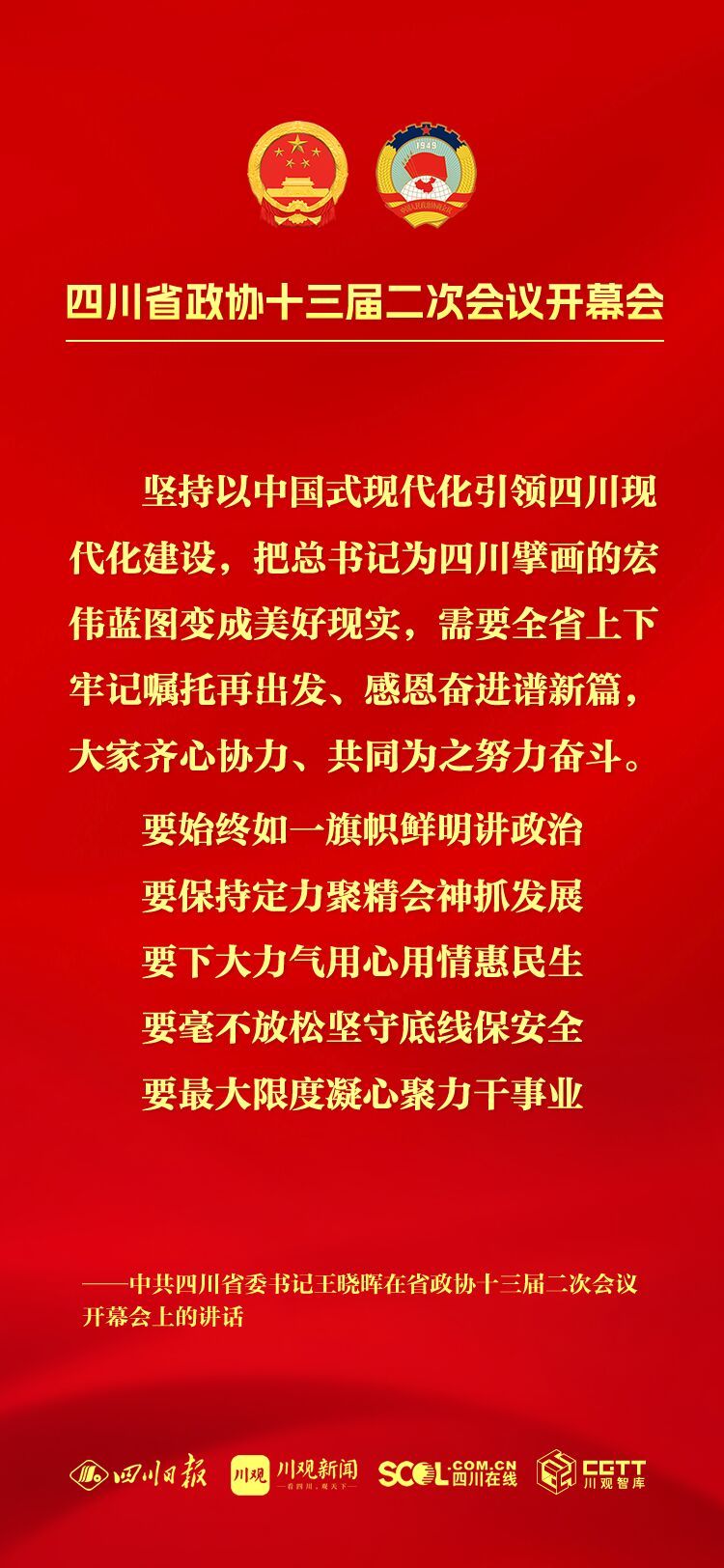 今年是中华人民共和国成立75周年,是实现“十四五”规划目标任务的关键一年,也是人民政协成立75周年,改革发展稳定任务艰巨繁重。坚持以中国式现代化引领四川现代化建设,把总书记为四川擘画的宏伟蓝图变成美好现实,需要全省上下牢记嘱托再出发、感恩奋进谱新篇,大家齐心协力、共同为之努力奋斗。