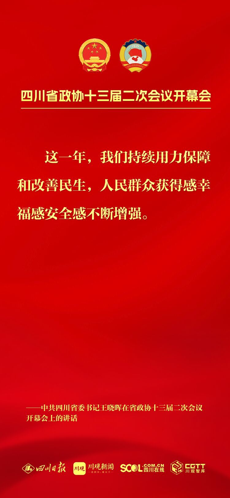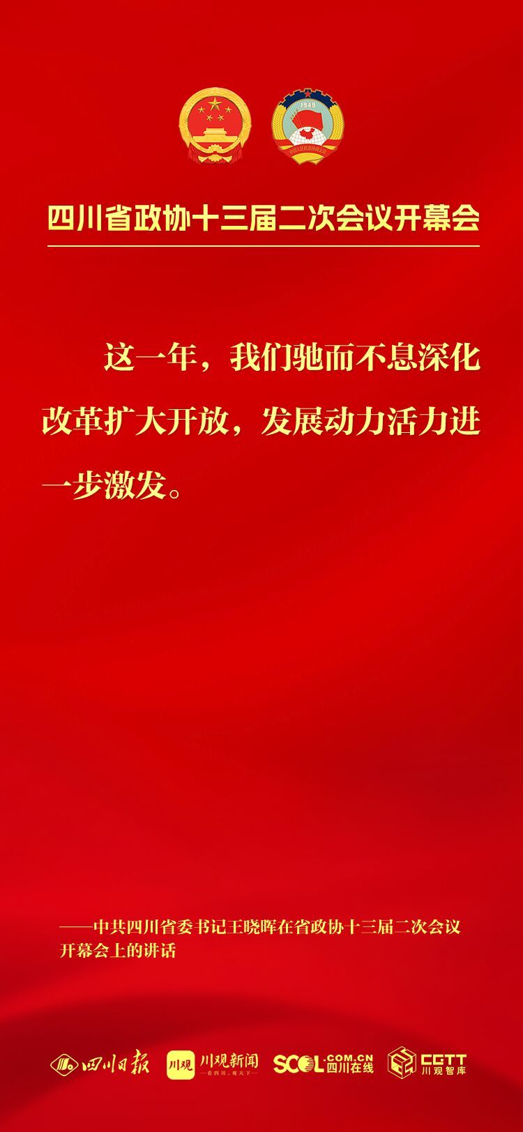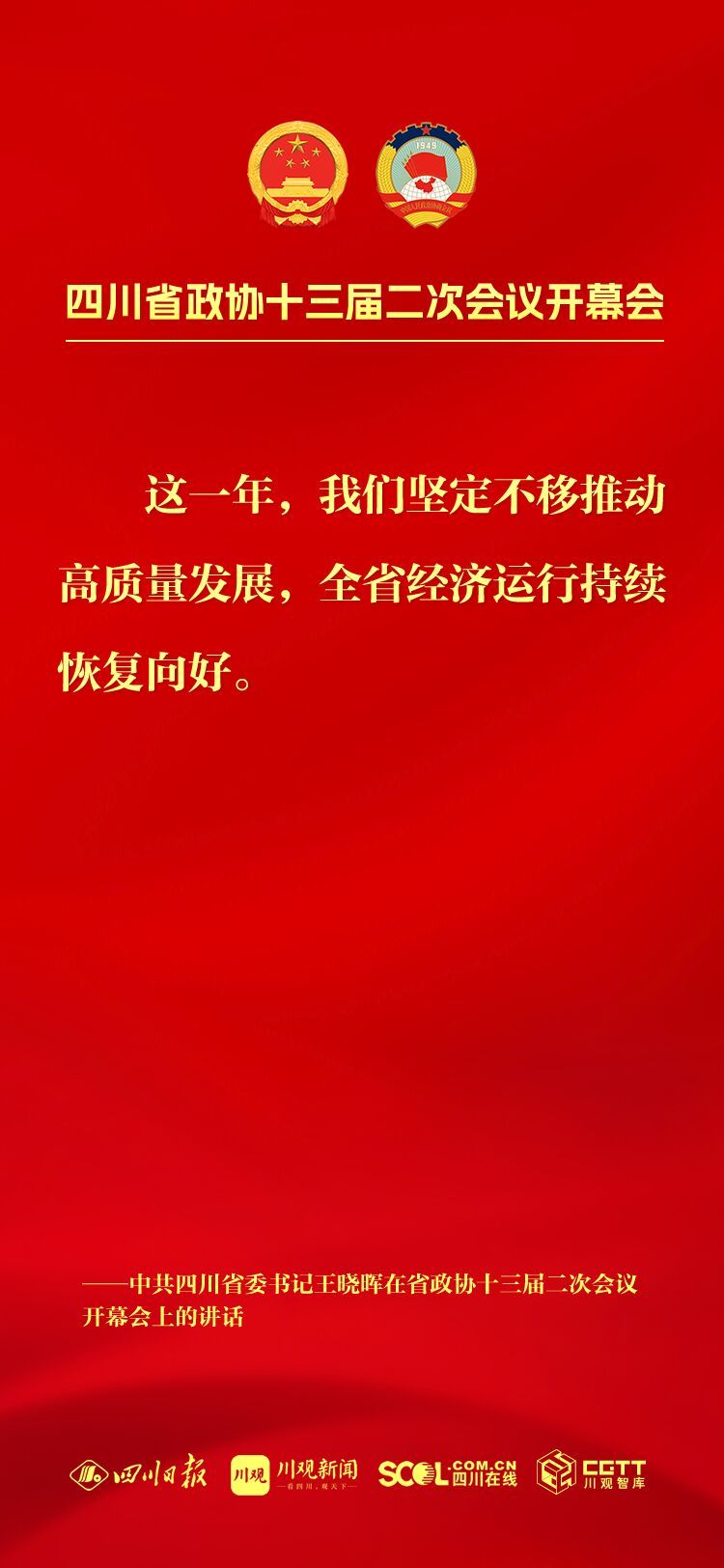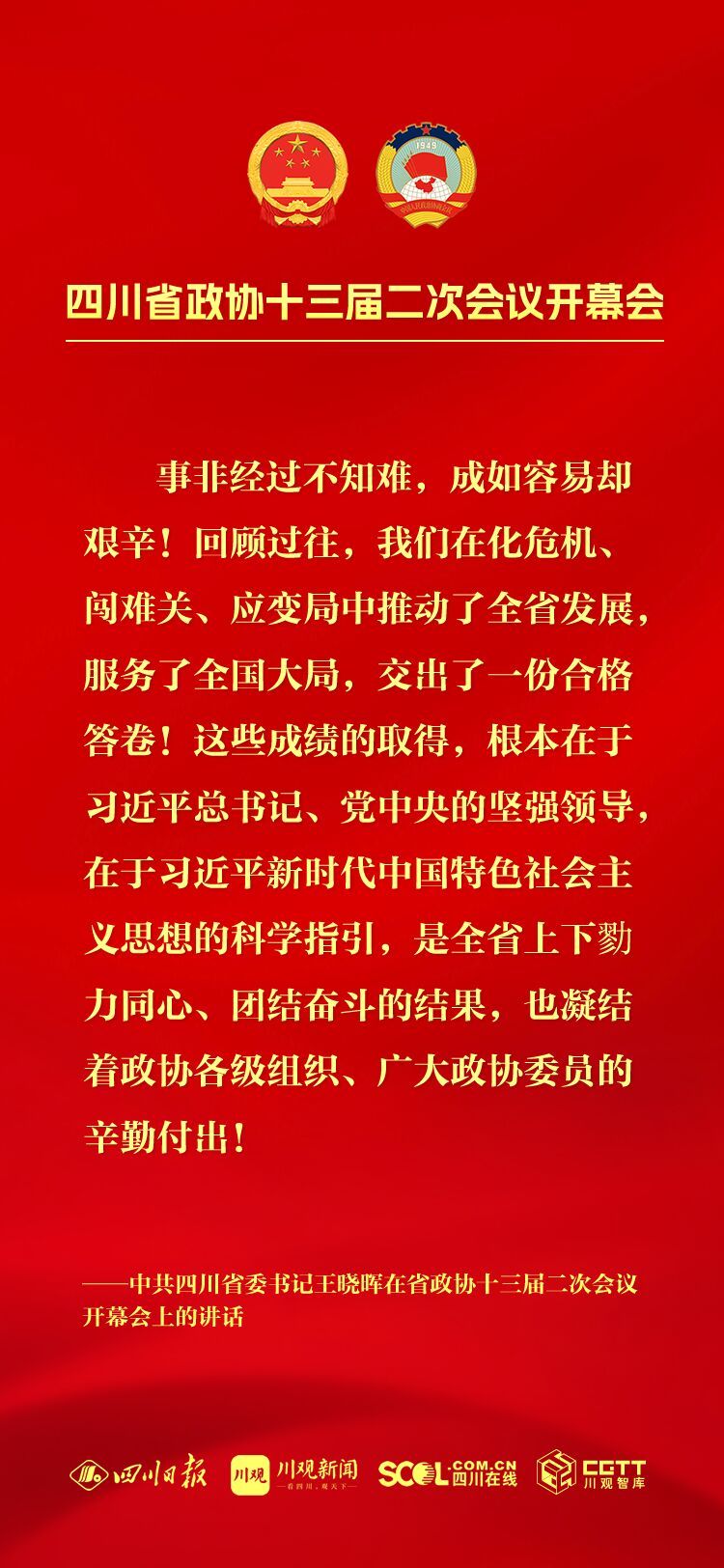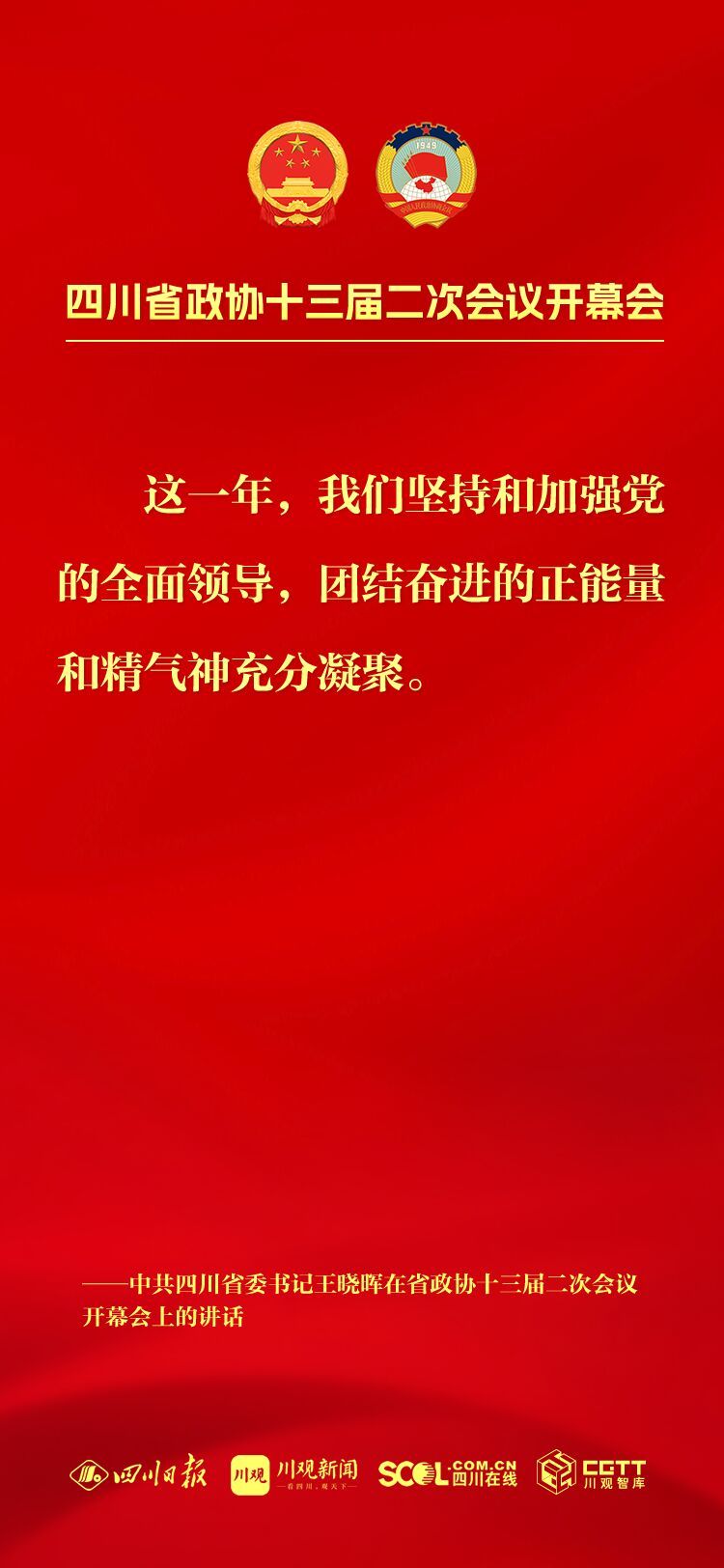 今年是中华人民共和国成立75周年,是实现“十四五”规划目标任务的关键一年,也是人民政协成立75周年,改革发展稳定任务艰巨繁重。坚持以中国式现代化引领四川现代化建设,把总书记为四川擘画的宏伟蓝图变成美好现实,需要全省上下牢记嘱托再出发、感恩奋进谱新篇,大家齐心协力、共同为之努力奋斗。