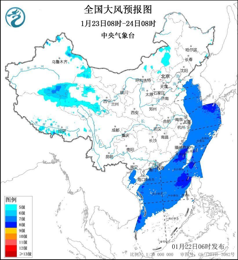 1月23日08时至24日08时,新疆北疆北部和东部、内蒙古中部、辽东半岛、山东半岛、江苏沿海、上海、浙江沿海、福建沿海、广东沿海及新疆南疆盆地和东部、甘肃河西等地有5~6级、阵风7级的大风;黄海大部海域、东海大部海域、台湾海峡、台湾以东洋面、巴士海峡、北部湾、南海北部和中部海域将有7~8级、阵风9~10级的偏北到东北风,其中台湾海峡部分海域风力可达9级、阵风10~11级。