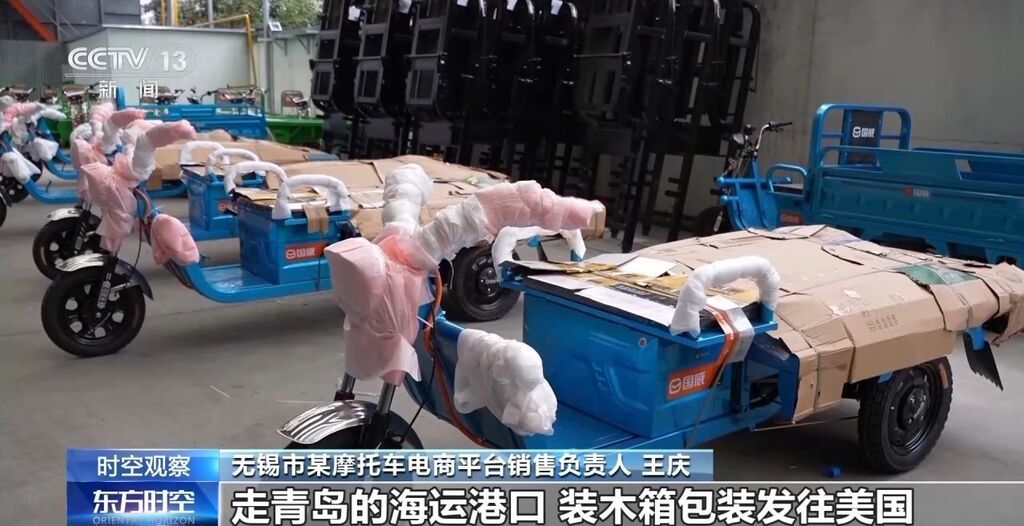 无锡市某摩托车电商平台销售负责人 王庆:包装好的三轮车是发往青岛,走青岛的海运港口,装木箱包装发往美国。