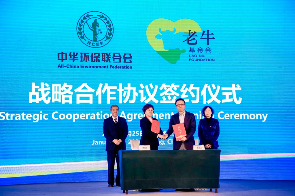 活动现场中华环保联合会与内蒙古老牛慈善基金会战略合作框架协议的签约并启动内蒙古近零排放示范项目。