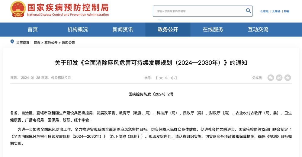记者28日从国家疾控局获悉,近日,国家疾控局等12部门联合印发《全面消除麻风危害可持续发展规划(2024-2030年)》,明确到2030年,实现全国麻风患病率大于1/10万的县(市、区)数为0,麻风患者完成治疗时新发生2级畸残比为0,促进消灭麻风的目标早日在中国实现。