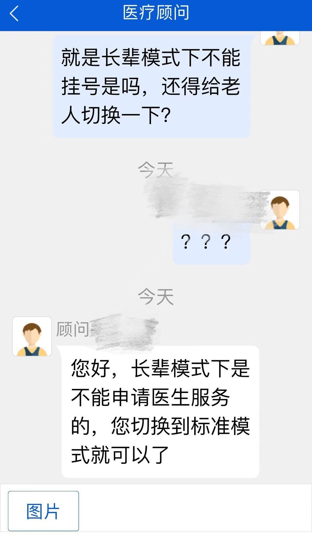 好大夫在线App的长辈模式,仅有“电话问诊”“我的订单”两个模块,还标注了“适合老年人使用”。然而记者在该模式下却找不到挂号的途径,咨询医疗顾问得知,“长辈模式下是不能申请医生服务的,您切换到标准模式就可以了。”
