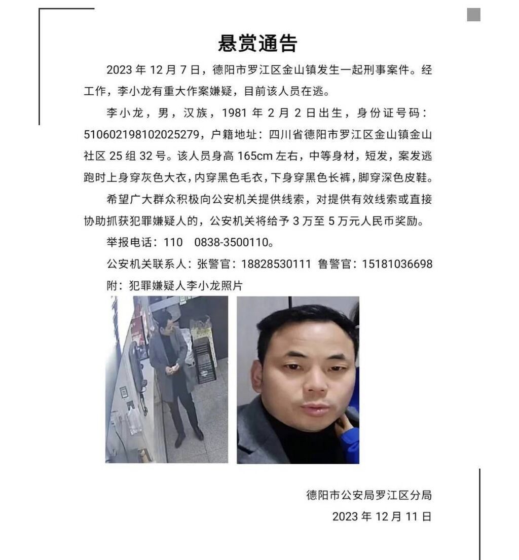 2023年12月11日,四川德阳市公安局罗江区分局曾发布悬赏通告称,2023年12月7日,德阳市罗江区金山镇发生一起刑事案件。经工作,42岁的李小龙有重大作案嫌疑,目前该人员在逃。希望广大群众积极向公安机关提供线索,对提供有效线索或直接协助抓获犯罪嫌疑人的,公安机关将给予3万至5万元人民币奖励。