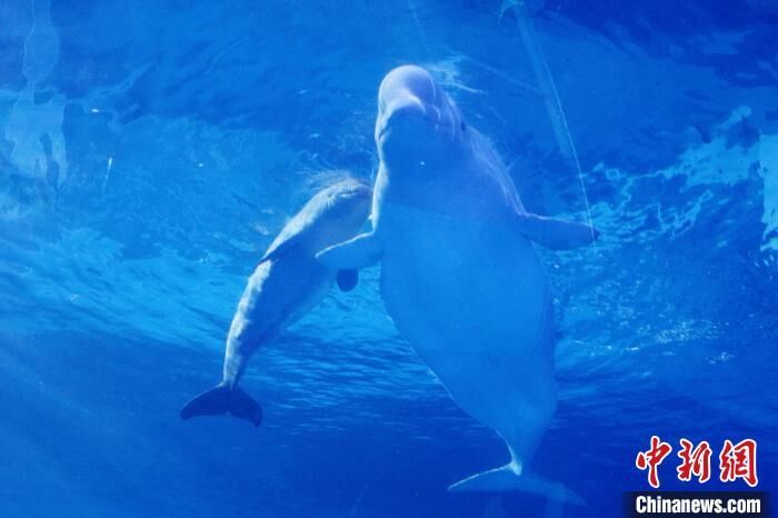 满月新闻发布会当天,在母鲸带领下,小白鲸“汤圆”公开亮相,为游客们带来了新春祝福。只见小白鲸依偎在母鲸旁,并时不时捣蛋玩耍,非常活泼调皮。母鲸和小白鲸一同在水中畅游,吸引了众多游客围观。