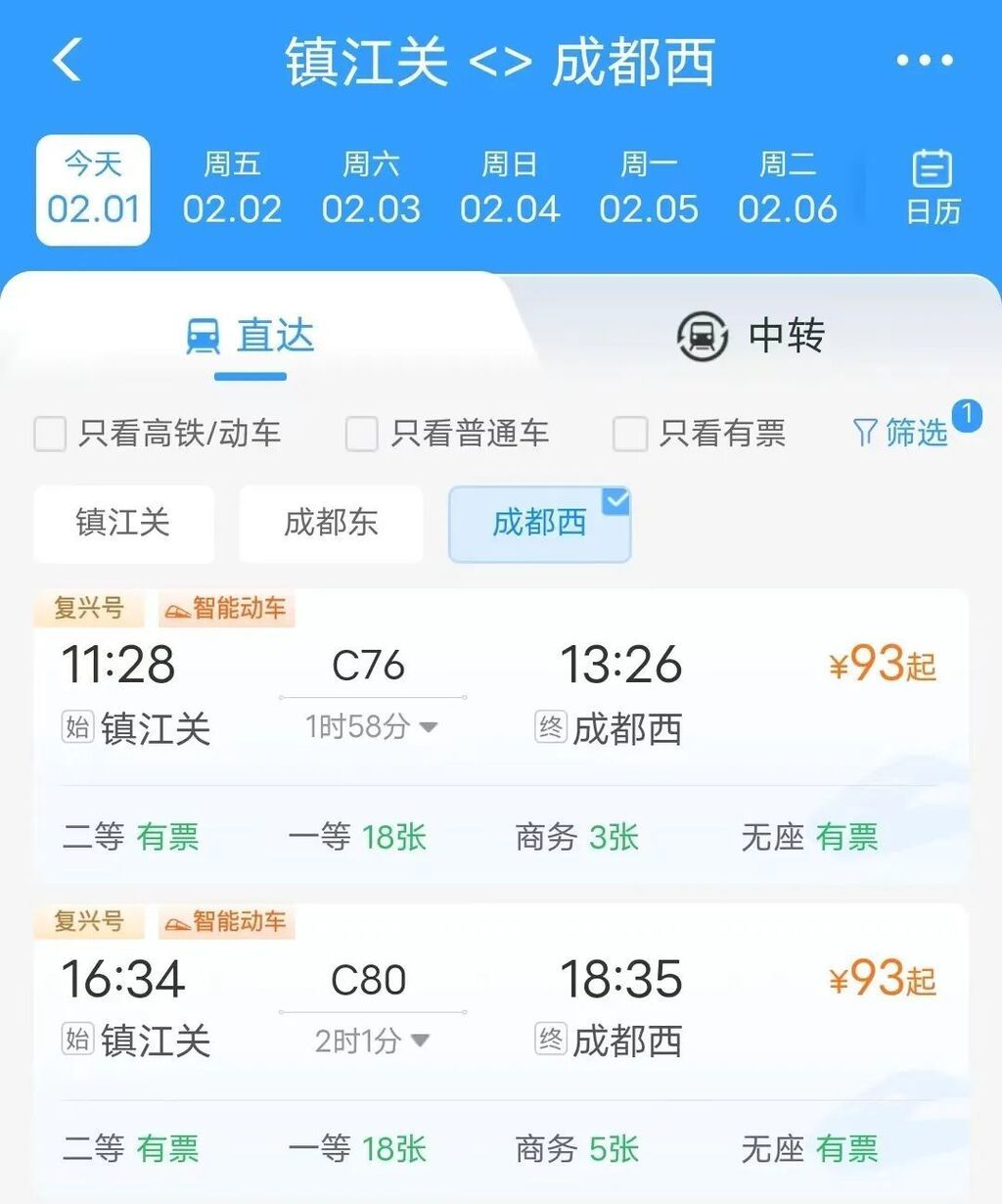 镇江关至成都西C80次列车,镇江关16时34分开,茂县17时10分到,成都西18时35分到。