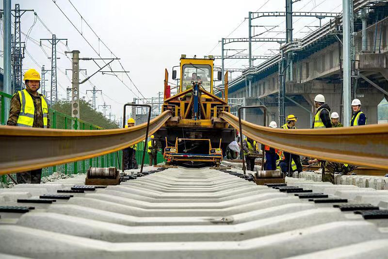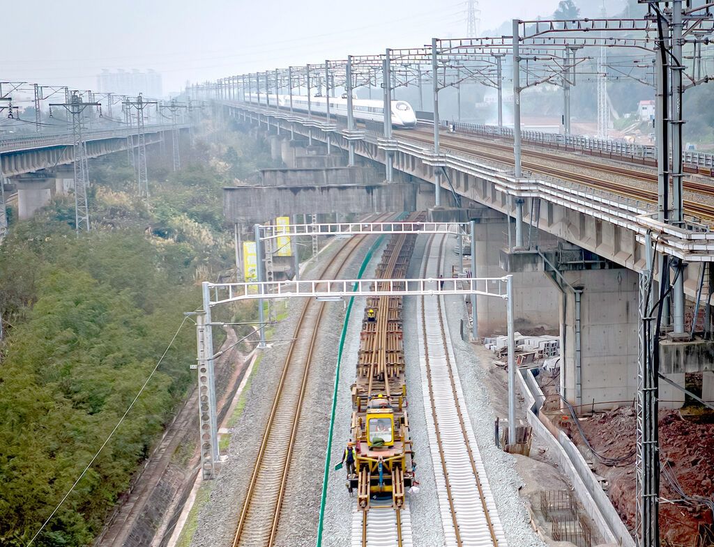 渝宜段共设置铺轨基地2处,分别为泸州铺轨基地和宜宾存轨场。针对长轨运输困难、交叉施工单位多等难题,京昆高铁西昆公司、中国铁路成都局集团有限公司多次组织中铁四局渝昆高铁川渝段站前四标项目部等参建单位召开协调会议,成立铺轨施工指挥协调小组和调度指挥中心,统一协调管理各单位工程线施工,顺利完成铺轨计划。
