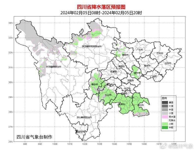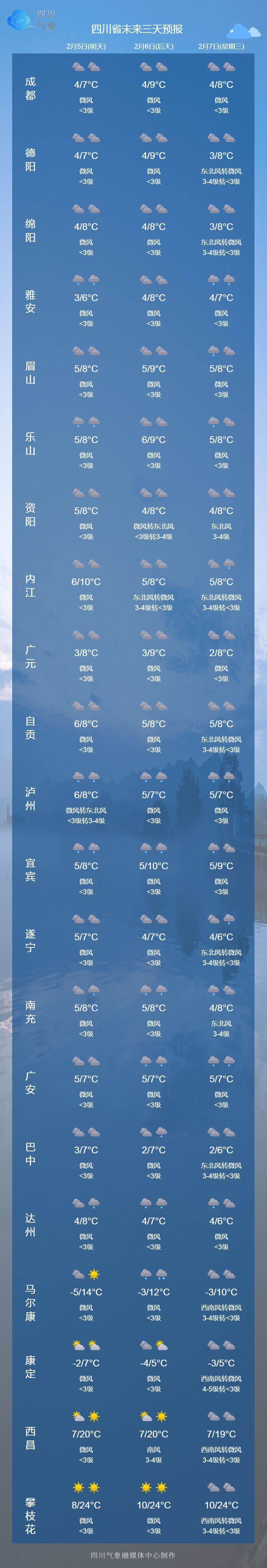 5日晚上到6日白天,盆地各市阴天,大部地方有小雨或零星小雨,高海拔山区有雨夹雪或小雪;甘孜州西北部、阿坝州北部东部和凉山州东北部多云间阴有阵雪(雨),局部有中雪,川西高原和攀西地区其余地方多云间晴。