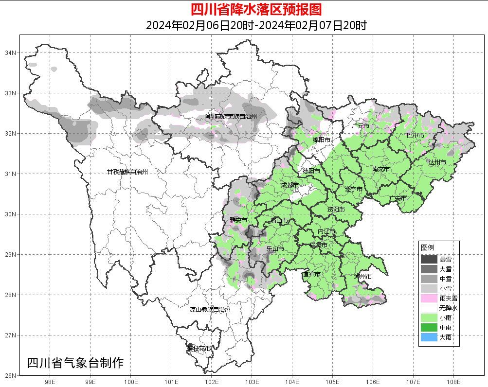 6日晚上到7日白天,盆地大部阴天有小雨或零星小雨,高海拔山区有雨夹雪或小雪;甘孜州北部、阿坝州中部和凉山州东北部多云间阴有阵雪(雨),局部有中雪,川西高原和攀西地区其余地方多云间晴。