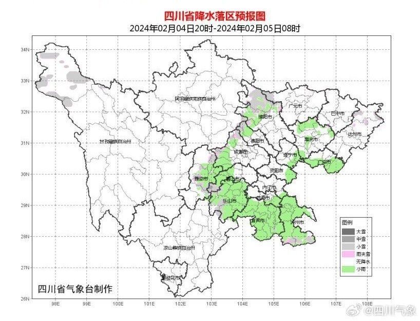 4日晚上,泸州、宜宾、乐山、雅安4市大部和绵阳、成都、眉山、德阳4市西部阴天有小雨或零星小雨,高海拔山区有雨夹雪或小雪,盆地其余地方阴天为主,局部地方有小雨;甘孜州西北部多云间阴有阵雪,川西高原其余地方和攀西地区多云间晴。