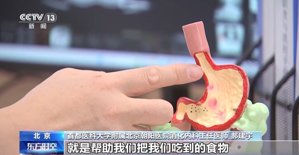 首都医科大学附属北京朝阳医院消化内科主任医师 郝建宇:这是胃的一个模型。胃里边是有很多的肌肉帮助我们,把我们吃到的食物磨到很细的一个程度,这就是物理消化过程,到了肠道以后,胰腺分泌的蛋白酶、脂肪酶、淀粉酶,要通过这三个酶把我们吃的这些物质消化成最小的单位,像葡萄糖、氨基酸和甘油三酯,只有消化到这种程度,人的肠道绒毛才能吸收它,把它吸收到血里头,如果你吃的蛋白质,特别是脂肪太多了,有可能消化酶就不太够用了。