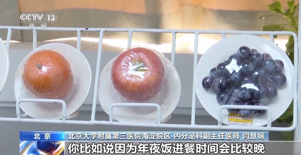 北京大学附属第三医院海淀院区 内分泌科副主任医师 闫慧娴:比如说年夜饭进餐时间会比较晚,下午3时左右,可以加一点餐,吃一些升糖指数比较低的一些水果,比如一个苹果是90千卡,在加餐的时候,可以选择半个苹果。或者坚果类,平时因为过年的时候大家可能比较喜欢吃这种花生瓜子这种坚果类的,15克的花生或瓜子,产生的热量跟一个苹果是一样的,所以大家加餐的时候可以适当来选择。避免低血糖,也避免在年夜饭的时候会吃更多的食物。
