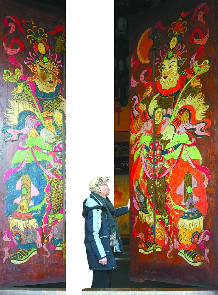 “每逢春节前,预定和修复门神画的客户就特别多,目前,我还有10余对等待绘制。”张桅告诉记者,阆中民居上的门神大多为虬髯短须,须不过颈,项圈白亮,挺胸凸肚,神气十足。“我在修补门神画的过程中总结出了阆中门神画还有两大特点,一是在用色方面继承了敦煌壁画明快、浓重、热烈的色彩特点。另一个特点就是在形象上,不同于‘要想门神好,头大身子小’,阆中门神画讲究高大威风、顶天立地,门有多大,门神就画多大,有的甚至画出了门外。”