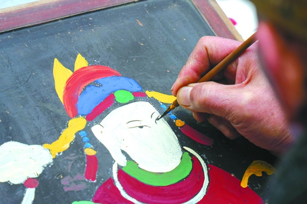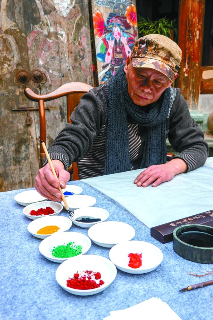 在绘画技法上,阆中门神画不同于浙江的漆画、陕西的板画,而是“胶画”。张桅介绍,过去的画师不仅要有绘画技艺,还要自己制作绘画材料。画师们用竹子做成画笔勾线,在纸上画好后,再拿到门上对应着图纸的线条打点,最后取下画纸,图的线条也印在门上了,再使用自己制作的矿物颜料,兑上适量的胶水上色,这就是“胶画”,能使门神画经久不变色。