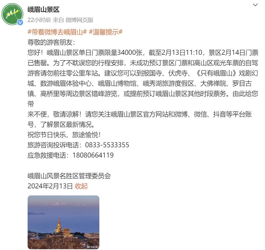 据峨眉山景区消息,峨眉山景区单日门票限量34000张,截至2月13日11:10,景区2月14日门票已售罄。为了不耽误您的行程安排,未成功预订景区门票和高山区观光车票的自驾游客请勿前往零公里车站。建议您可以到报国寺、伏虎寺、《只有峨眉山》戏剧幻城、数游峨眉体验中心、峨眉山博物馆、峨秀湖旅游度假区、大佛禅院、罗目古镇、高桥里等周边景区错峰游览,或提前预订峨眉山景区其他时段票务。