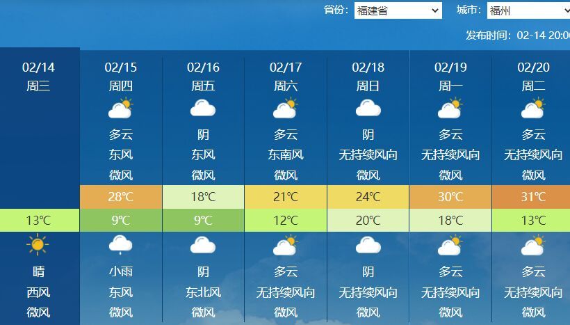 ↑ 福州19日和20日最高气温已预报到了30℃,足见回暖之强!