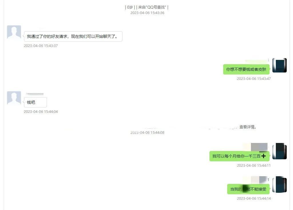 他在私聊中频繁以“赠送游戏皮肤”“每月给钱”为诱饵,试探对方是否能接受“无底线听话”和“脱衣”等。如对方有意向,便互加为QQ好友继续下一步引诱。