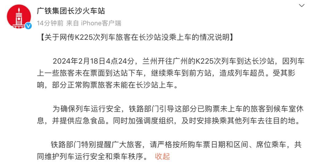 2024年2月18日4点24分,兰州开往广州的K225次列车到达长沙站,因列车上一些旅客未在票面到达站下车,继续乘车到前方站,造成列车超员。受其影响,部分正常购票旅客未能在长沙站上车。