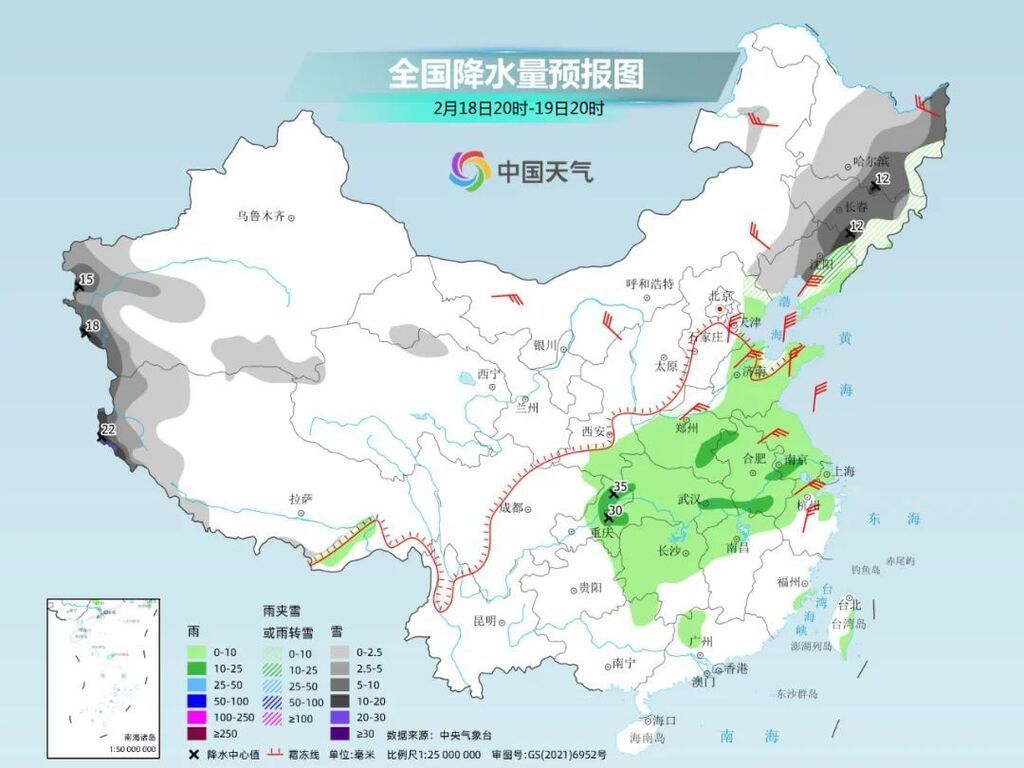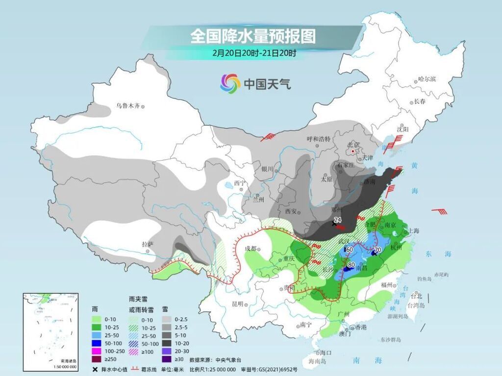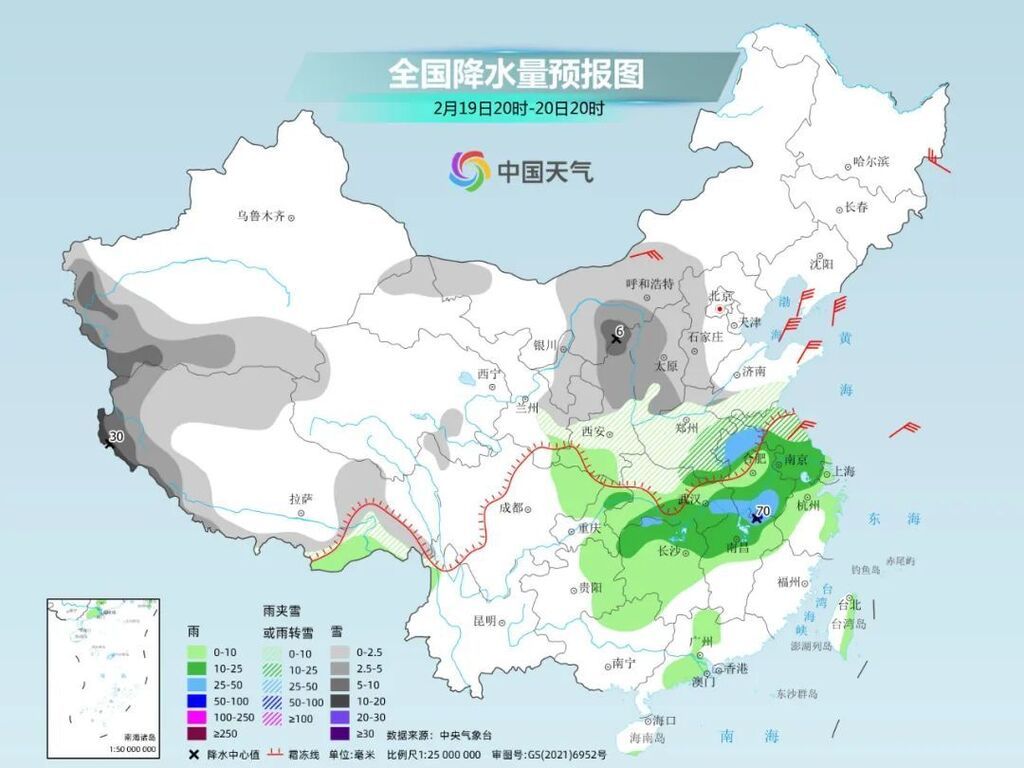 20日开始,雨雪将进入鼎盛时段。对于黄淮南部、江淮、江汉、江南中北部来说,降水的初期为降雨,并会伴随雷暴、短时强降水、局地风雹等强对流天气。
