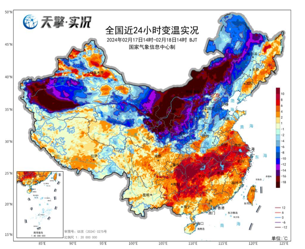 从24小时变温图上可以看到,今天白天,我国南北两边的天气大相径庭。北边一片红得发紫是受寒潮影响的剧烈降温;而南边一片火红是在暖湿气流控制下的快速升温 ,湖南、湖北、江西等地多个站点今天最高气温突破2月同期极值。