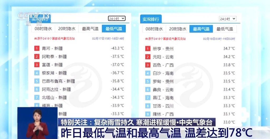 中央气象台发布的气温实况显示:2月17日15时至18日14时的最低气温在新疆青河,为-43.3℃。而18日3时至19日2时记录到的最高气温在贵州册亨,为34.7℃。也就是说,昨天最冷和最热温差达到78℃。