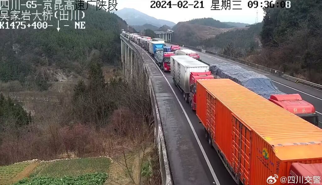 其中G5京昆高速广元段、广陕段(广元至陕西方向),因陕西境内下冻雨,主线1520公里处道路封闭,所有车辆从广元站、中子站出站。