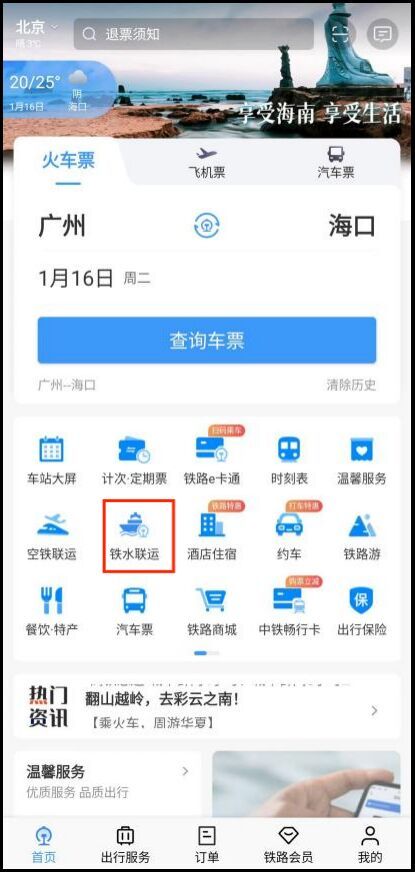 点击12306App首页的“铁水联运”小图标或通过火车余票查询页“铁水联运”推荐专栏进入。