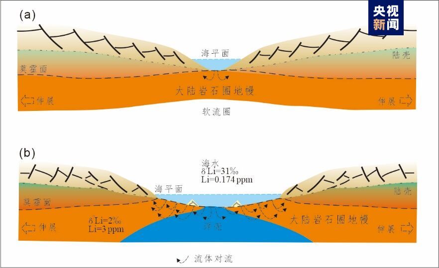 在大陆裂解过程中,地幔橄榄岩逐渐上浮,露于海底。海水渗透到尚处于较热状态的地幔橄榄岩中。在这个阶段,地幔橄榄岩具有足够的能量,供海水中的锂元素扩散到橄榄石中,并且锂同位素分馏程度非常低,使得橄榄石保存了海水锂同位素特征。