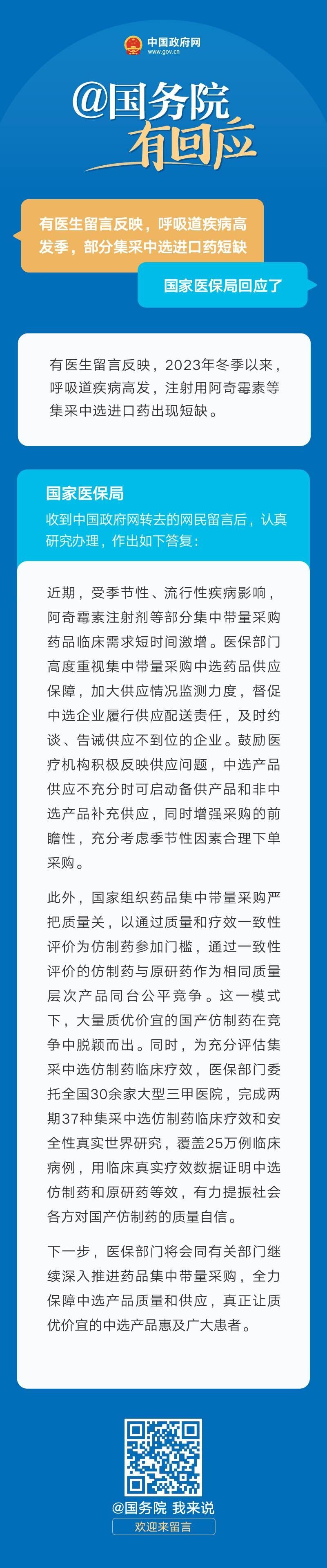 据中国政府网2月22日消息,有医生留言反映,2023年冬季以来,呼吸道疾病高发,注射用阿奇霉素等集采中选进口药出现短缺。