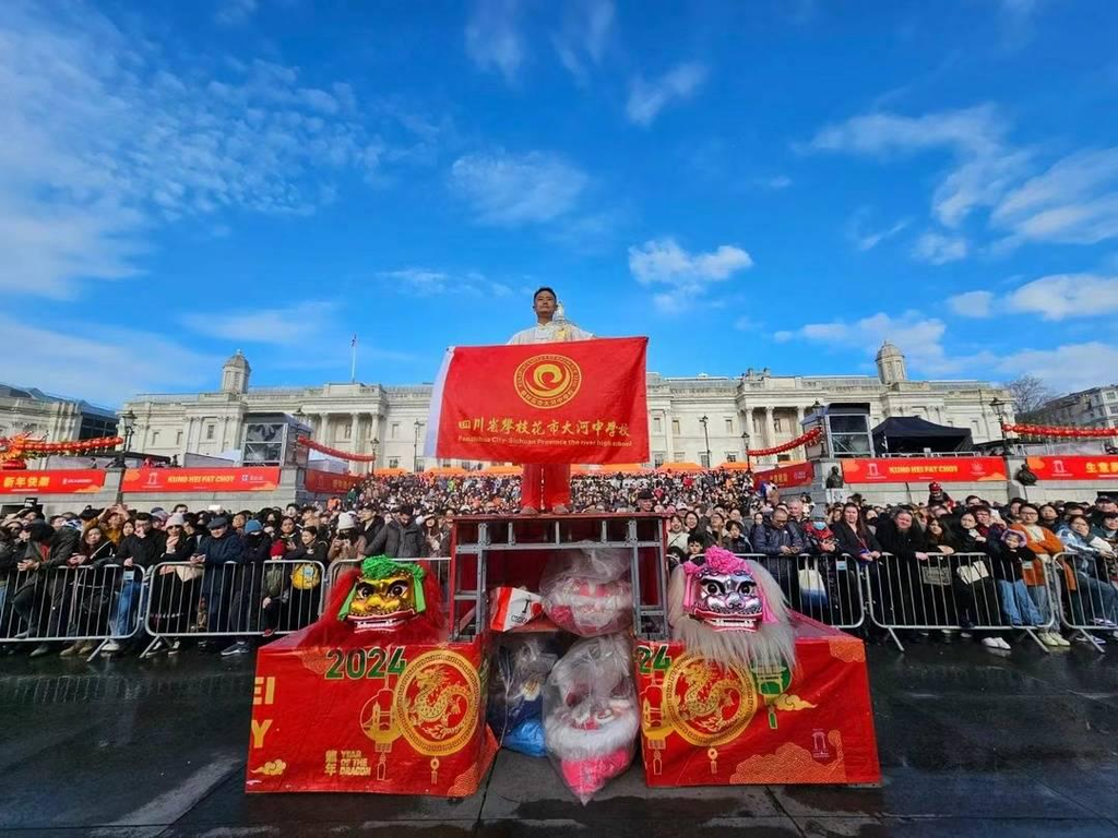 当地时间2月11日,英国伦敦,2024“四海同春”新春庆典在特拉法加广场举行,吸引了当地众多市民参与。庆典上,两头狮子踩着音乐的节拍,奔跑跳跃,闪转腾挪,献上了一段长达8分钟的“两狮戏珠”精彩表演,现场观众不断鼓掌欢呼。