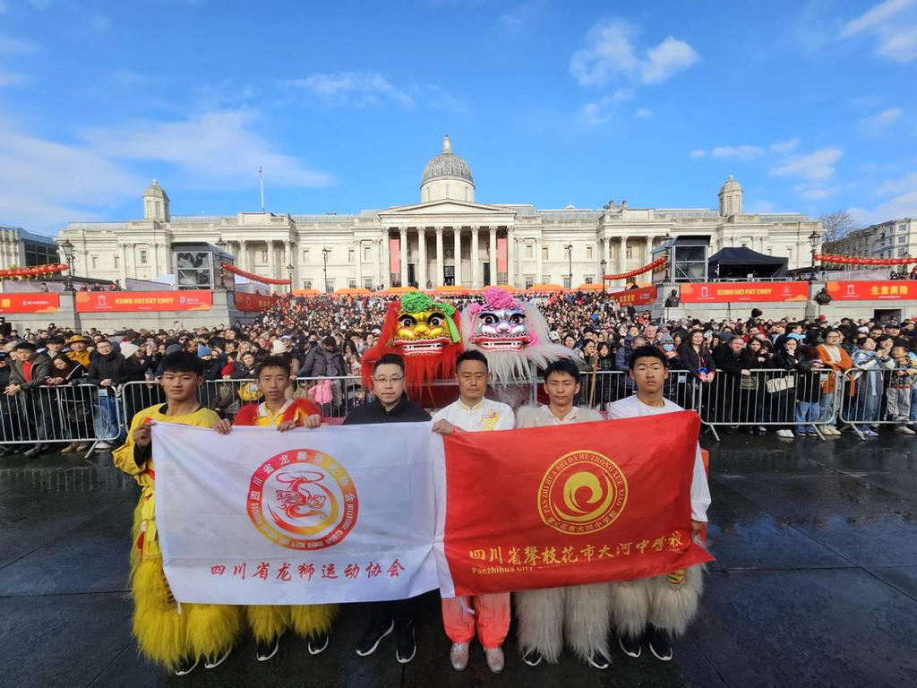 舞狮表演者,是来自四川省攀枝花市仁和区的大河中学北狮队。他们向前来观看表演的观众,送上来自中国的诚挚新春祝福,展示了中华传统文化的独特魅力。
