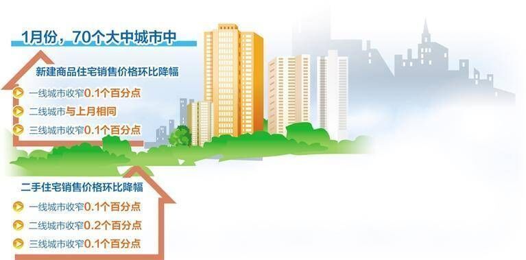 1月份,70个大中城市中,新建商品住宅和二手住宅销售价格环比下降城市分别有56个和68个,比上月分别减少6个和2个。