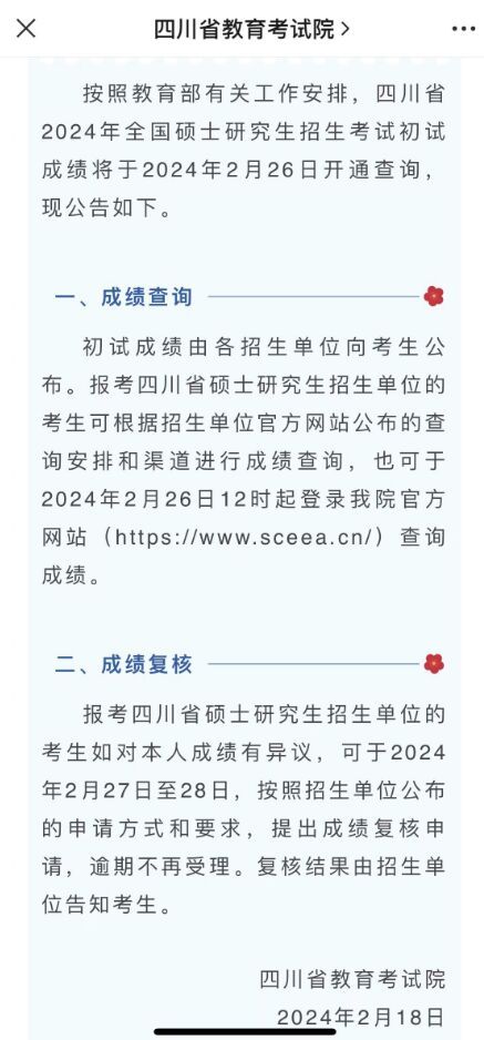 其中,四川省2024年全国硕士研究生招生考试初试成绩将于2024年2月26日开通查询。