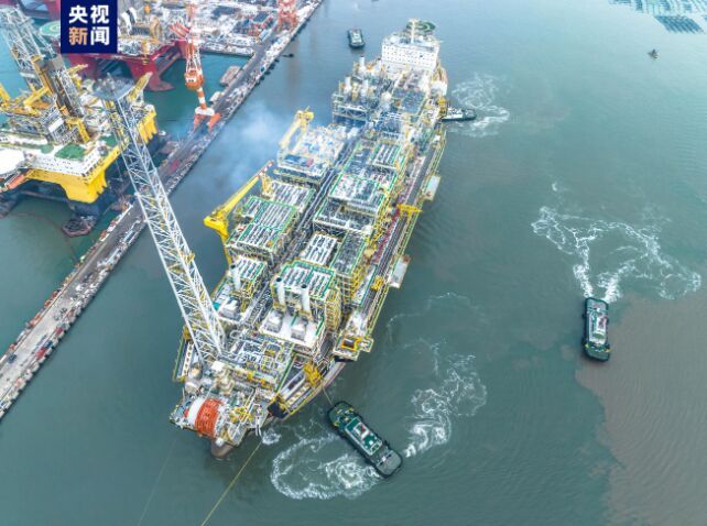 该船总长341.2米、最大宽度77米,体量超过了目前世界上最大的航母,是一座集生产处理、储存卸载、人员居住、生产指挥于一体的“海上石油加工厂”,日可处理原油18万桶,储油量可达145万桶,将安装在约2050米水深的作业地。(总台记者 陈永庆 张斌)
