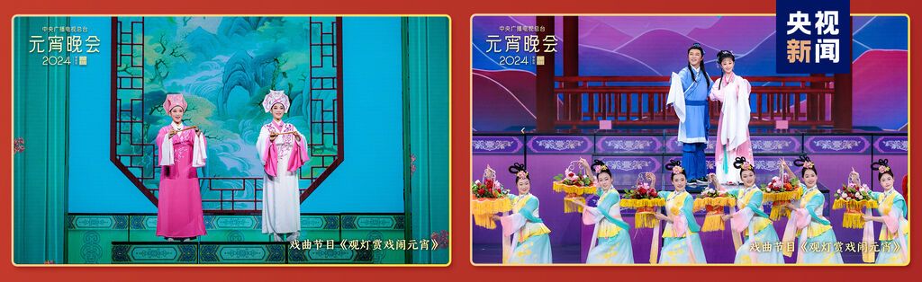 戏曲节目中,伴随着“火树千春妍,元夕月正圆,欢歌笑语喧”的戏腔戏韵,闽剧戏歌首次亮相总台元宵晚会。其他剧种还玩上了跨界表演,熟悉的旋律响起,站在舞台上的表演者却是令人直呼意外的“混搭”组合。陈丽君与黄龄携手带来越剧《梁祝》选段,潘柠静与沙溢共唱黄梅戏《天仙配》,在上元之夜演绎传世爱情故事,“戏曲真的出圈了”“谁说年轻人不听戏,永远为经典唱段打call”。