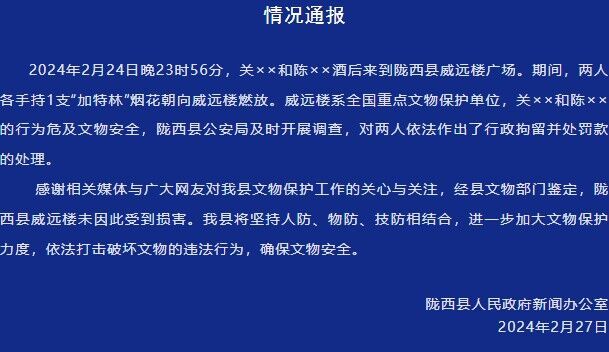 2024年2月24日晚23时56分,关××和陈××酒后来到陇西县威远楼广场。期间,两人各手持1支“加特林”烟花朝向威远楼燃放。威远楼系全国重点文物保护单位,关××和陈××的行为危及文物安全,陇西县公安局及时开展调查,对两人依法作出了行政拘留并处罚款的处理。