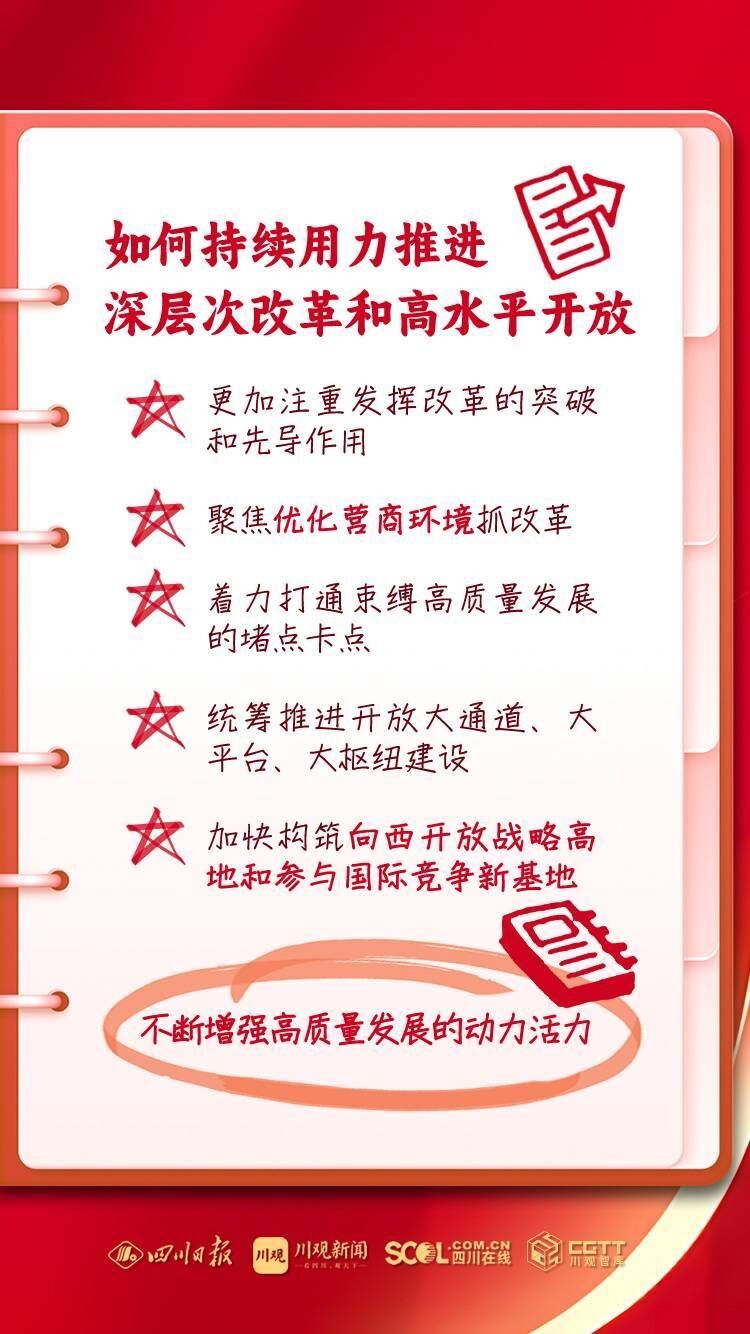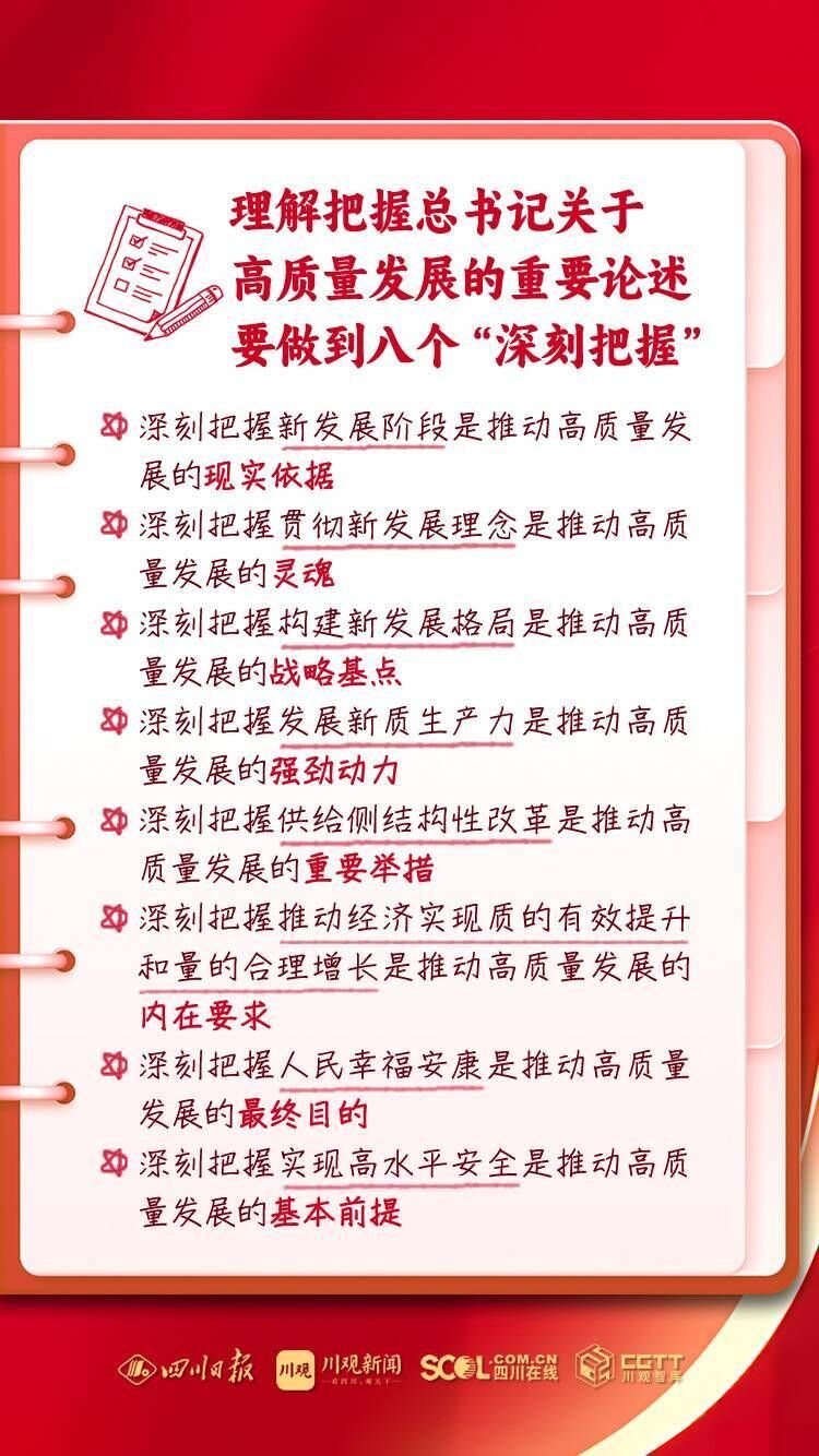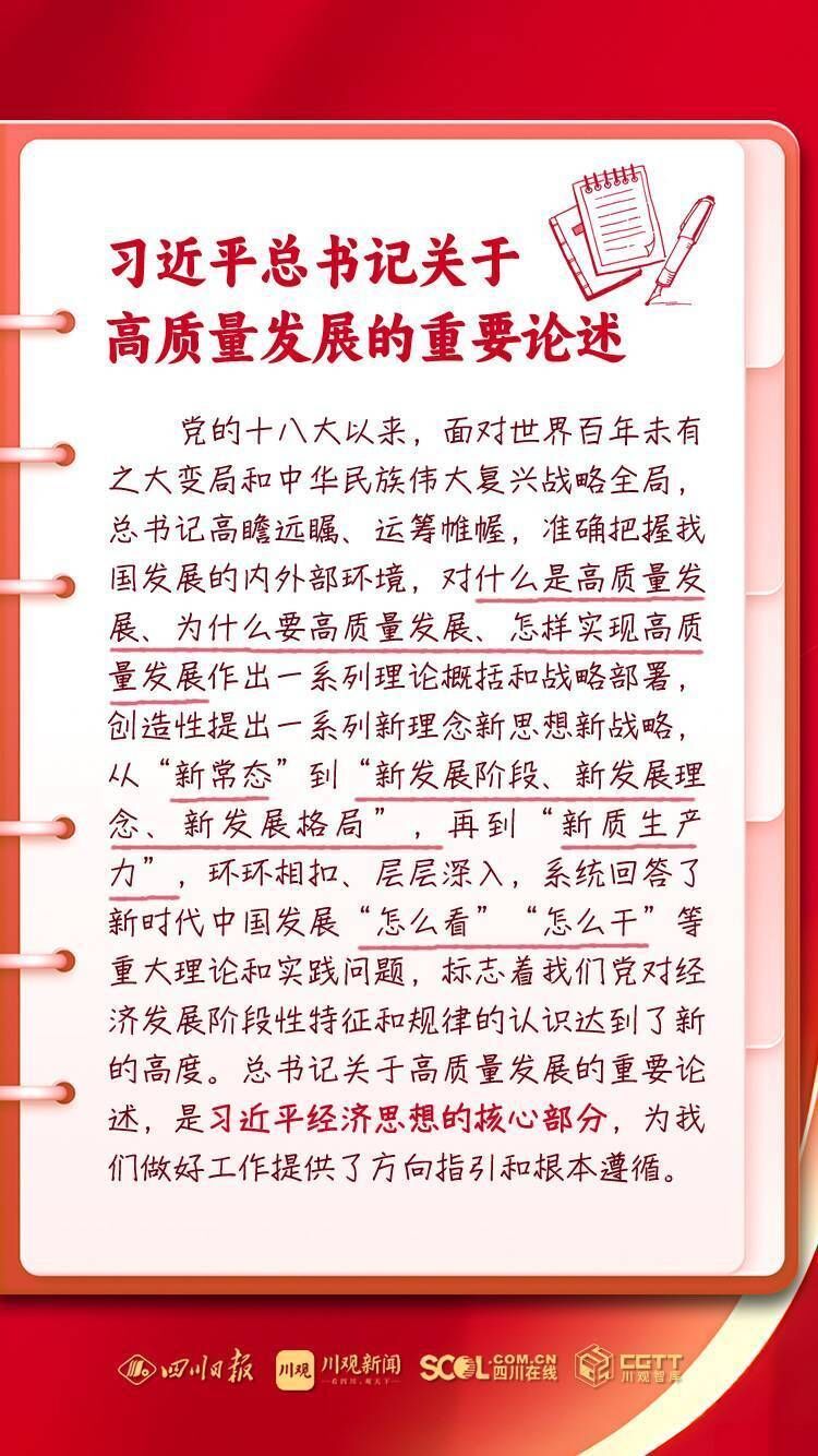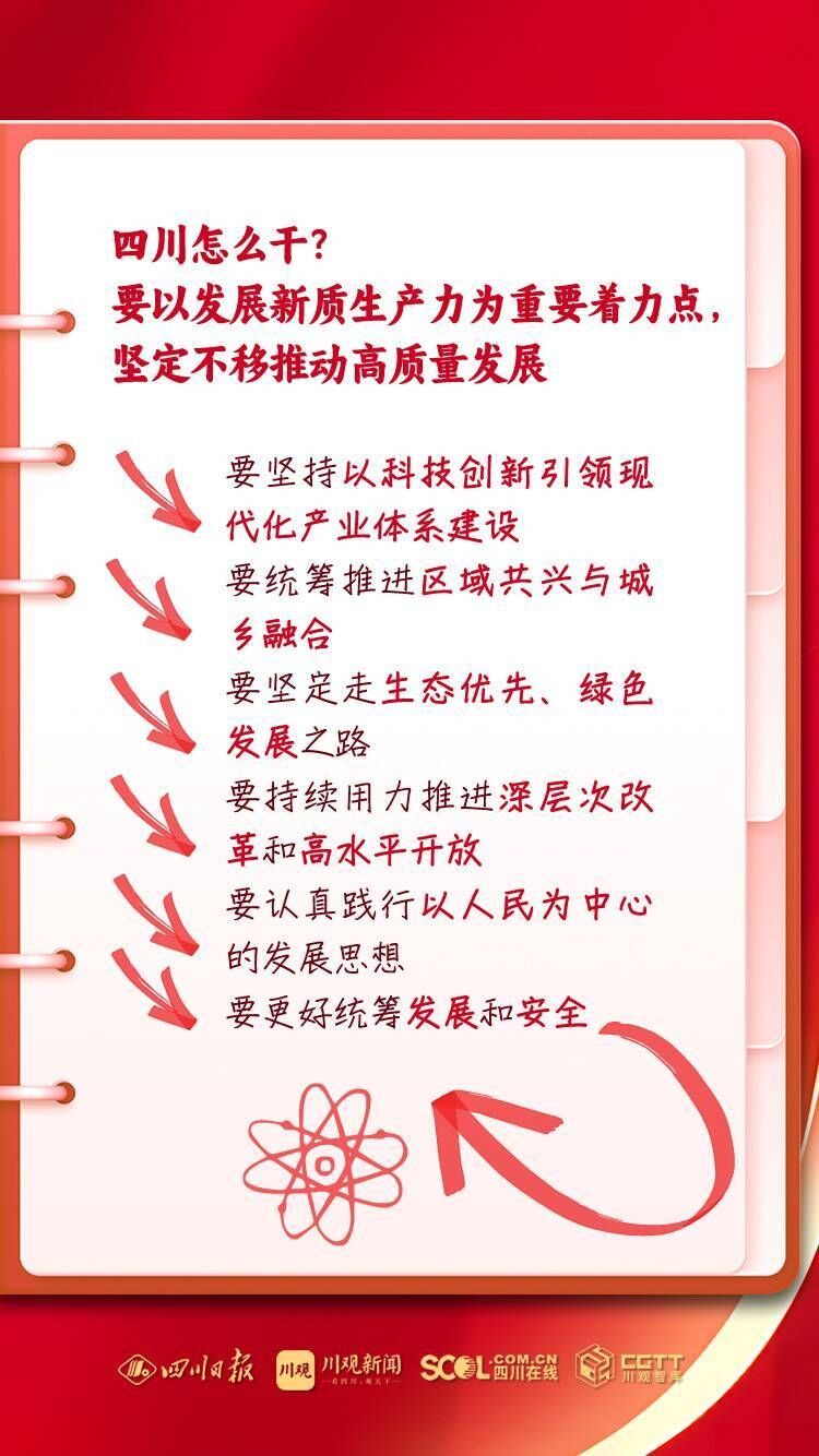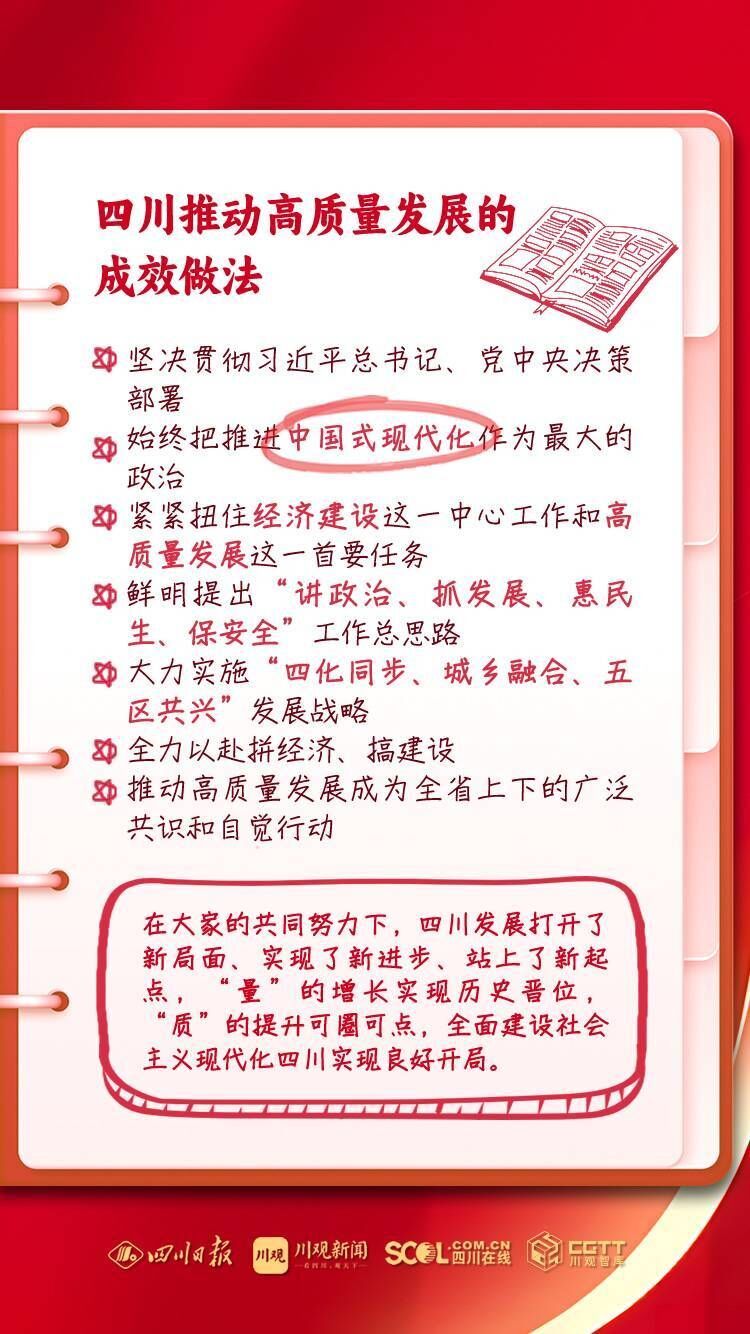 省委书记、省人大常委会主任王晓晖强调:习近平总书记赋予我们“尽快成为带动西部高质量发展的重要增长极和新的动力源”的重要使命,四川理应在理解把握和推动发展新质生产力、推动高质量发展上走在全国前列。要深入学习贯彻总书记关于高质量发展的重要论述和对四川工作系列重要指示精神,始终牢记高质量发展是新时代的硬道理,以发展新质生产力为重要着力点,扎实推动高质量发展,奋力谱写中国式现代化四川新篇章。