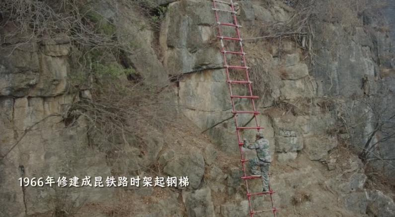 1966年修建成昆铁路的铁道兵们为古路村村民,在通往外界的藤梯的基础上焊起钢梯。