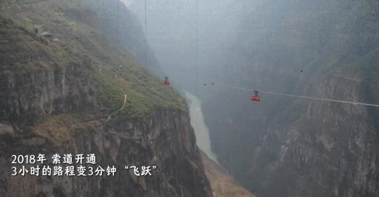 2018年,跨度为760米的索道正式开通,村民们3小时的崎岖悬崖路只需要3分钟就可“飞跃”。