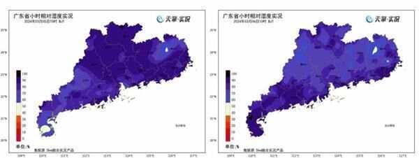 ▲以广东为例,今天上午10时大部地区相对湿度降至70%左右,相比昨天的90%,已经在减轻了。