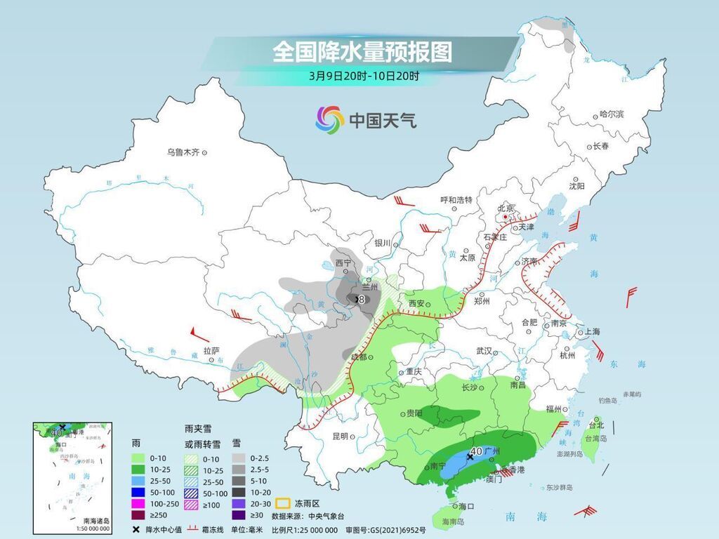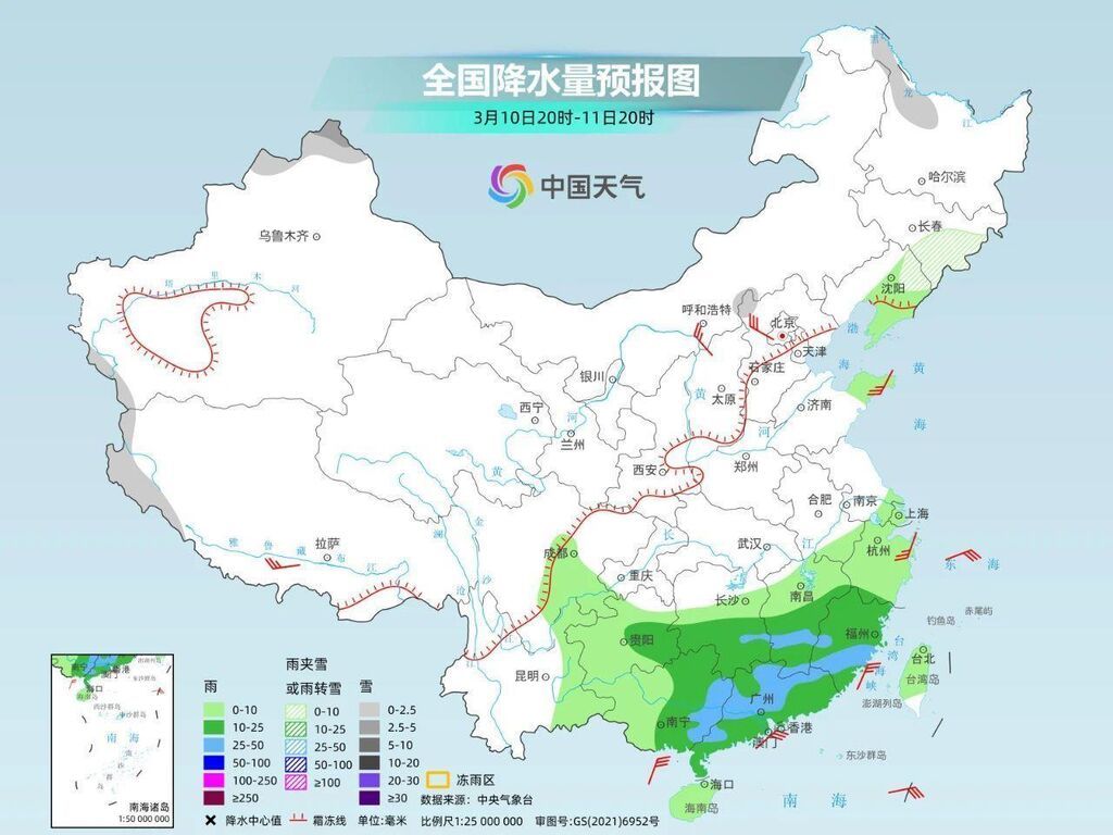 南方阴雨频繁:随着水汽条件转好,明天江南、华南一带雨势将显著增强,预计湖南南部、江西中南部、福建西部、广西东部、广东北部有中到大雨,广西、广东交界部分地区有暴雨。11日随着冷空气南下,南方阴雨迅速减弱消退,12日大范围阴雨短暂间歇,13日起新一轮阴雨上线,之后广西东部、广东、福建等地部分地区又将有大到暴雨。