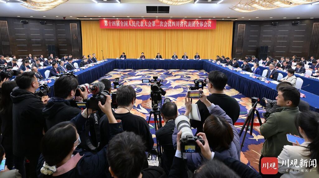 3月10日上午,出席十四届全国人大二次会议的四川代表团在驻地举行全体会议,继续审议全国人大常委会工作报告、最高人民法院工作报告、最高人民检察院工作报告。省委书记、省人大常委会主任、代表团团长王晓晖主持会议。省委副书记、省长、代表团副团长黄强,省委副书记、成都市委书记、代表团副团长施小琳参加。