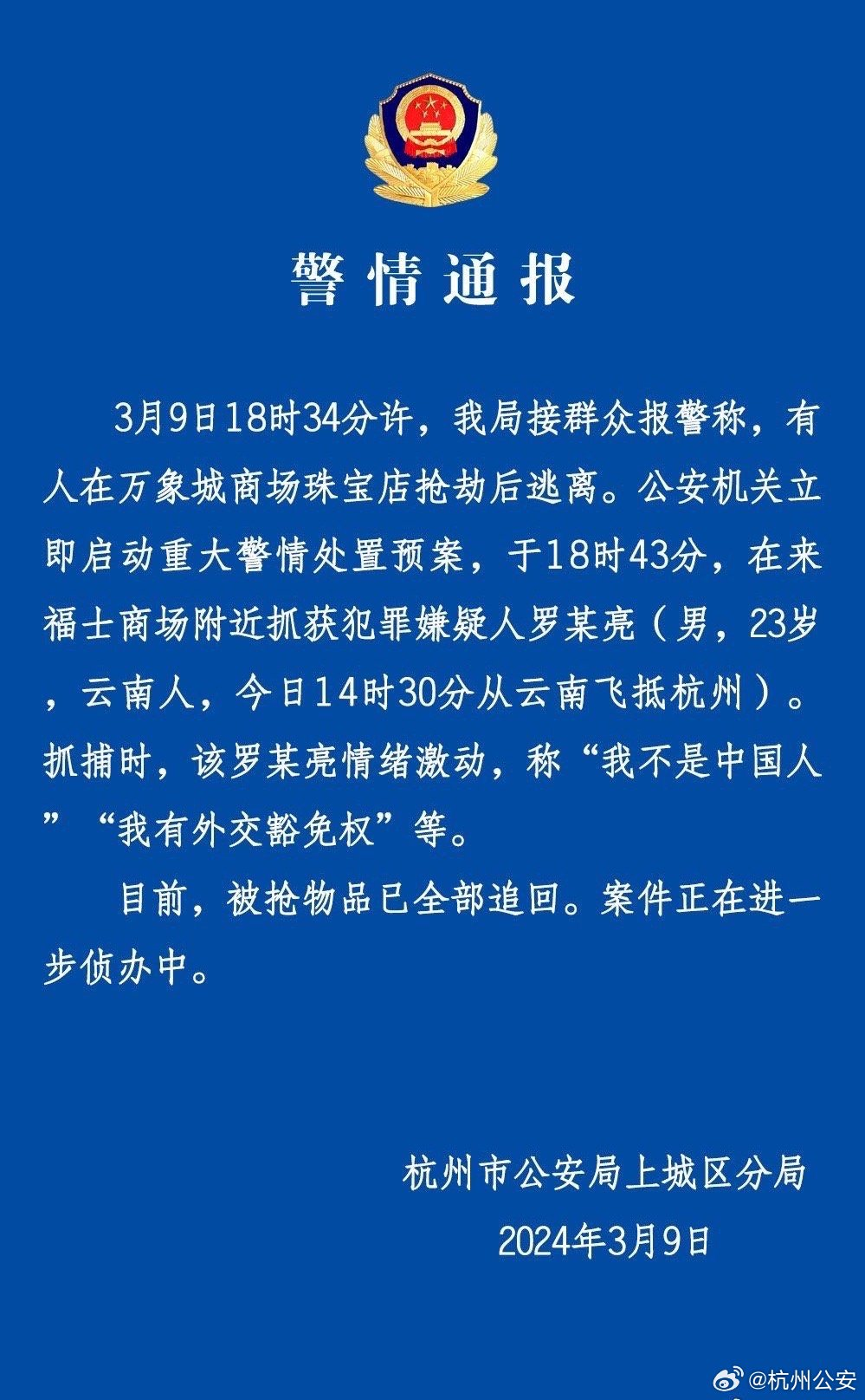 ·杭州市公安局上城分局通报杭州一商场男子抢劫金店。